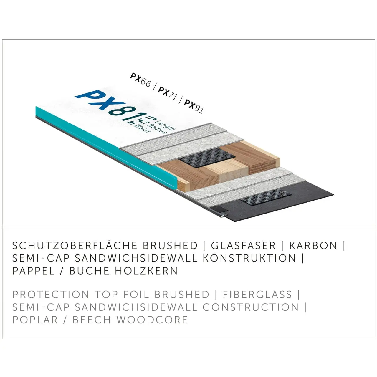 Divertimento assicurato sulle piste, in tutte le condizioni: il versatile PX71 è il compagno perfetto. La costruzione sandwich-sidewall rinforzata in carbonio, con HOLLOWTECH 3.0 e l’anima in legno pregiato garantiscono un’ammortizzazione e una presa di spigolo superiori, anche alle alte velocità.